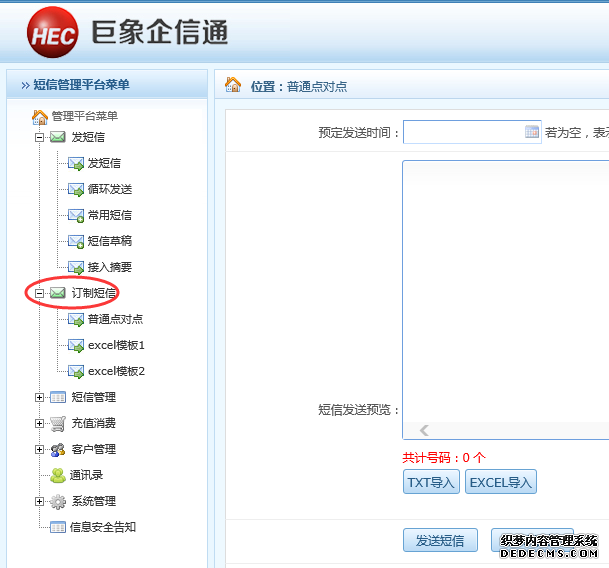 二、內容有變量(如內容里需插入稱呼、工資明細、物業管理費明細、快遞單號)的短信群發操作請選擇界面上左側導航條中的訂制短信,有三個模板供選擇