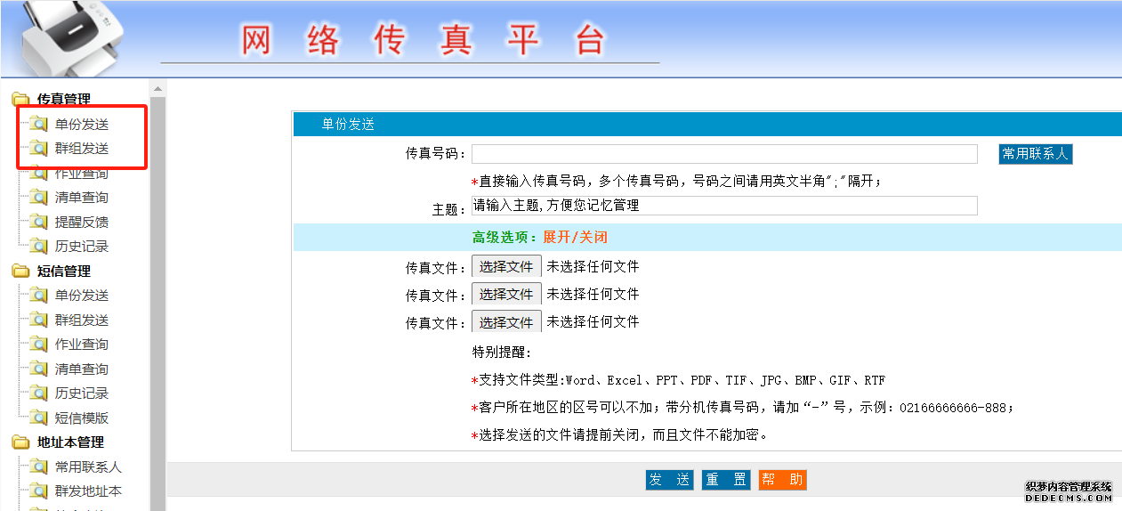 這種情況推薦使用網絡傳真平臺軟件系統。 只要電腦能上網,無需傳真機和任何其他軟硬件,也不用占用電話線,即用電腦網絡發傳真;可以單份發送傳真也可以群發傳真,還可以一次發多份傳真文件。
