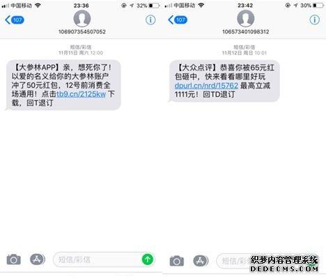 當我們查閱兩條短信內容時,會發現,短信要表達的意思大致相同,都是送紅包,但排版的不一樣,導致最后兩條短信內容的點擊率存在了差距。所以說,排版時,主要將重要信息放在前面,讓用戶在短信預覽時就能夠迅速的抓住重點,并促使用戶打開短信閱讀詳細內容。