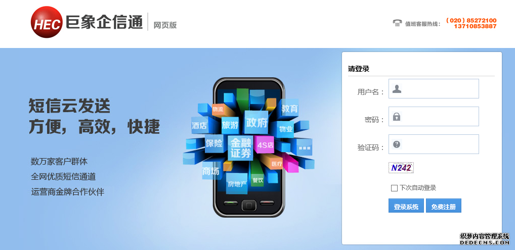 巨象公司成立于2004年,巨象企信通短信群發(fā)平臺(sms.hechina.cn)是廣州巨象計算機科技發(fā)展有限公司旗下的短信服務品牌,是巨象公司針對廣大企事業(yè)單位的移動辦公、信息發(fā)布、客戶服務、營銷推廣等日常商務活動而研發(fā)的,具備強大的數(shù)據(jù)管理、短信通訊功能的企業(yè)級短信群發(fā)軟件平臺;軟件平臺功能強大,客戶數(shù)據(jù)存儲本地化;用戶無需添加額外的硬件設備,不必升級原有的軟件系統(tǒng),輕松下載或網(wǎng)頁登錄即可擁有 。10多年短信行業(yè)積累,上萬客戶信賴,移動、聯(lián)通、電信三網(wǎng)均可發(fā)送,全國覆蓋。