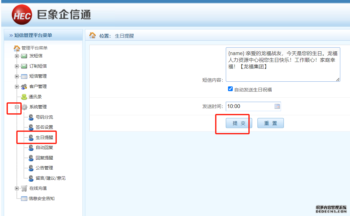 二、注冊后登錄短信平臺系統進入短信發送界面,如下圖所示,可以自動定時給員工、客戶發生日祝福短信(導入通訊錄時需填上生日日期)