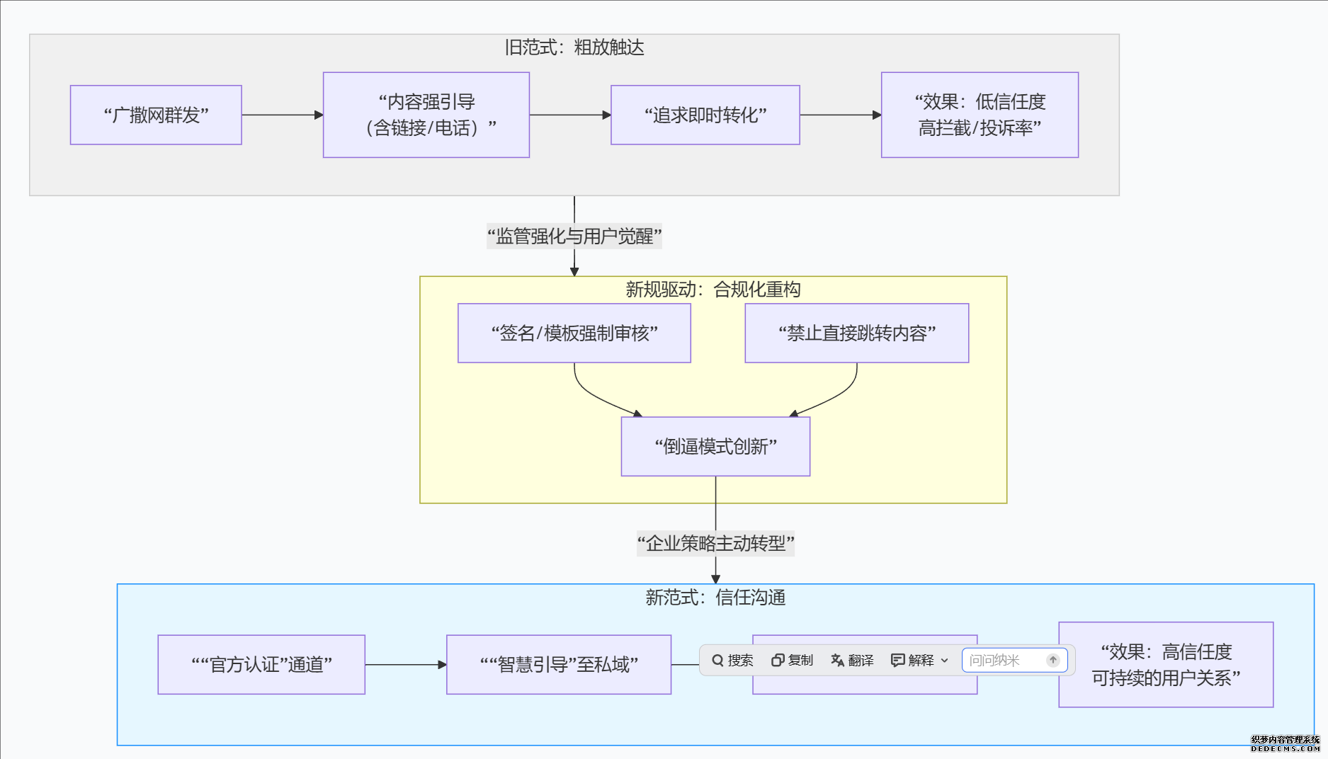 禁止鏈接與直接聯(lián)系方式的新規(guī),看似斬?cái)嗔藗鹘y(tǒng)的轉(zhuǎn)化路徑,實(shí)則倒逼企業(yè)進(jìn)行更精細(xì)化的用戶運(yùn)營。營銷的核心從“即時(shí)轉(zhuǎn)化”遷移至“關(guān)系培育”。企業(yè)需設(shè)計(jì)全新的引導(dǎo)話術(shù),例如: