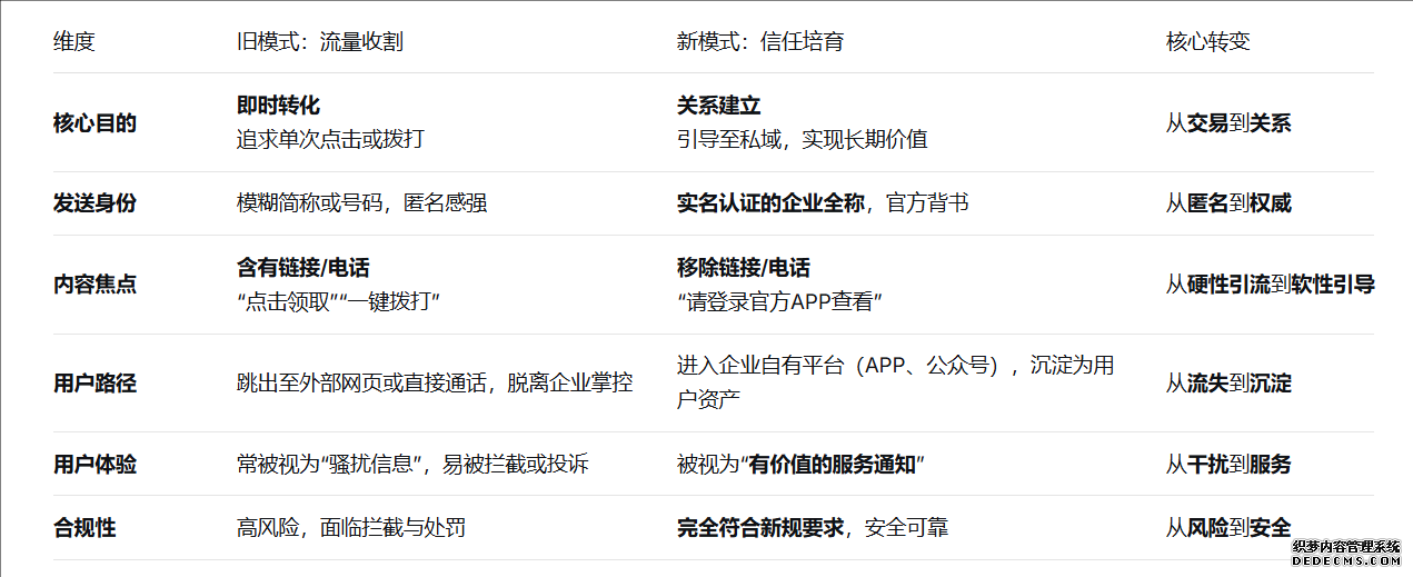 在通信監(jiān)管日趨嚴(yán)格、用戶隱私意識覺醒的當(dāng)下,那條曾被視為“直接觸達(dá)通道”的企業(yè)營銷短信,正站在變革的十字路口。2025年一系列新規(guī)的實(shí)施,并非簡單意義上的“限制”,而是一次深刻的行業(yè)價(jià)值重構(gòu)。它促使企業(yè)必須告別過去廣撒網(wǎng)、強(qiáng)干擾的粗放模式,轉(zhuǎn)而將短信營銷升維為一個(gè)基于合規(guī)前提、信任基石與價(jià)值交互的精準(zhǔn)溝通體系。企業(yè)若想在其中贏得先機(jī),關(guān)鍵在于實(shí)現(xiàn)三大核心轉(zhuǎn)變。