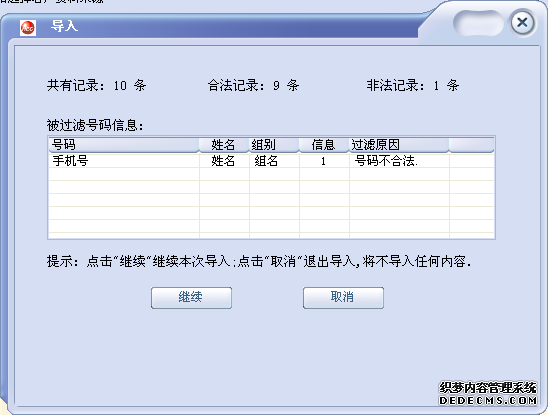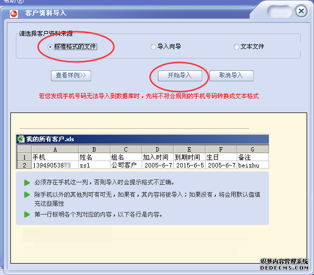 如果您的數據是文本格式,第一列為手機號,第二列為姓名,第一列與第二列之間用TAB鍵隔開。