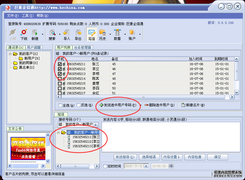 選擇所要發送號碼的文件夾,在號碼前畫∨再點“發送選中用戶號碼”所選號碼將出現在接收號碼對話框中。如下圖所示: